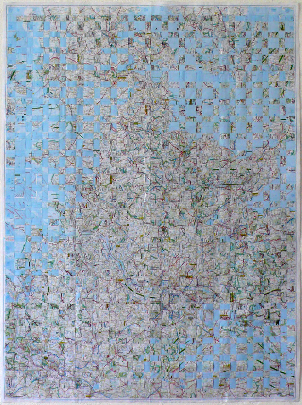 | "Le baiser d'Europe" détail. 107 x 128 cm. Crayons de couleur sur carte routière. |